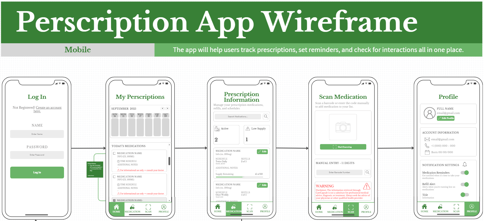 A mobile app that helps users manage medications through prescription scanning, reminders, and safety alerts.